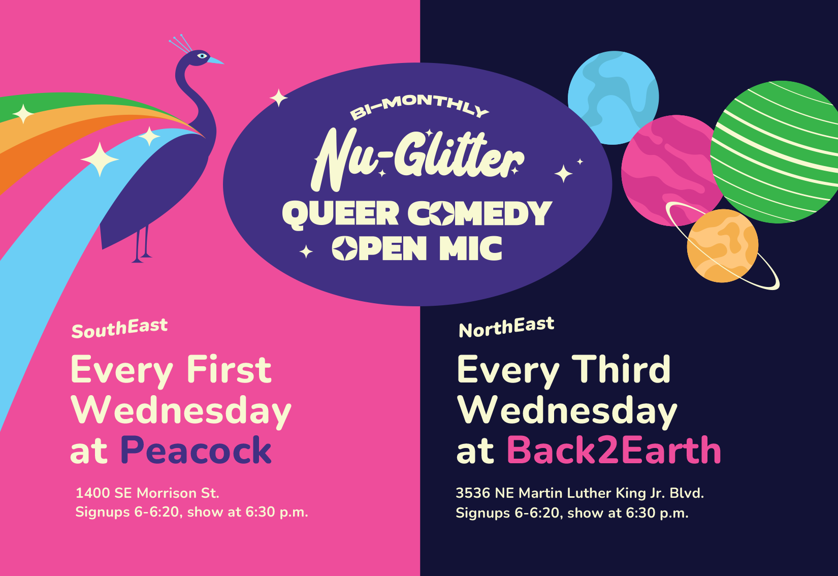 Nu-Glitter is a queer comedy open mic that happens twice a month – once in Southeast Portland and once in Northeast Portland.